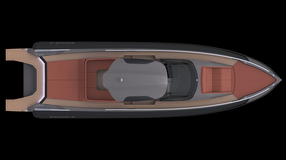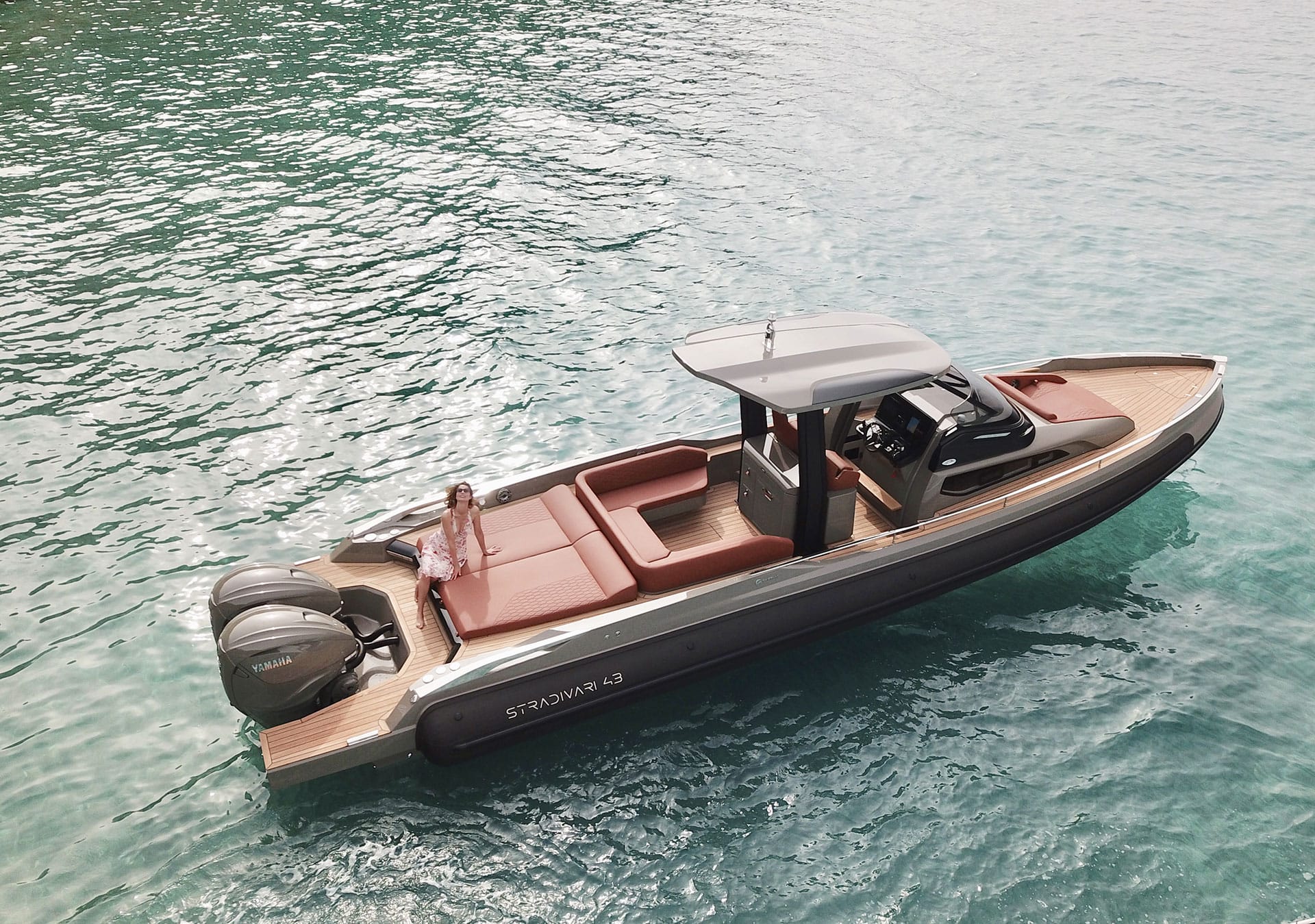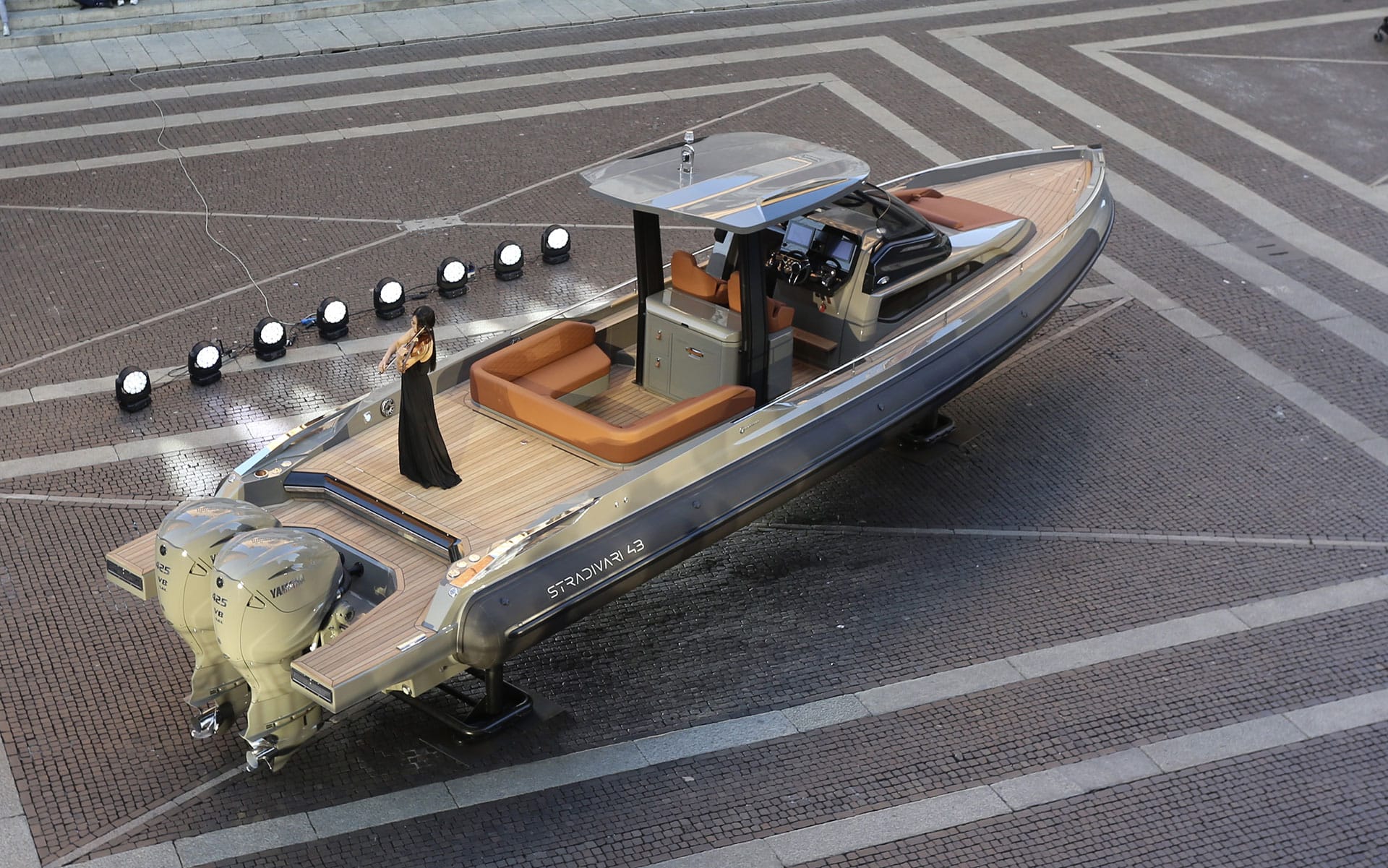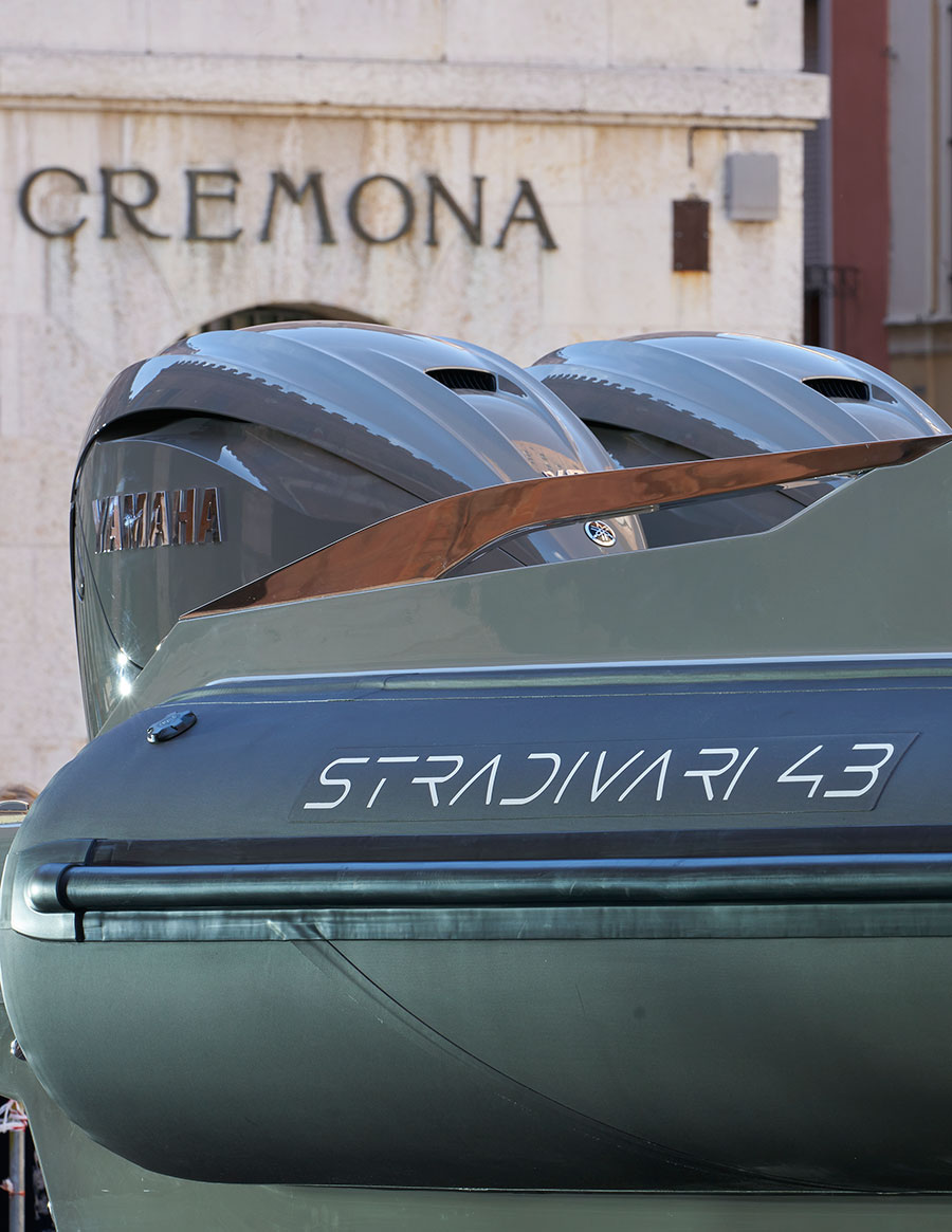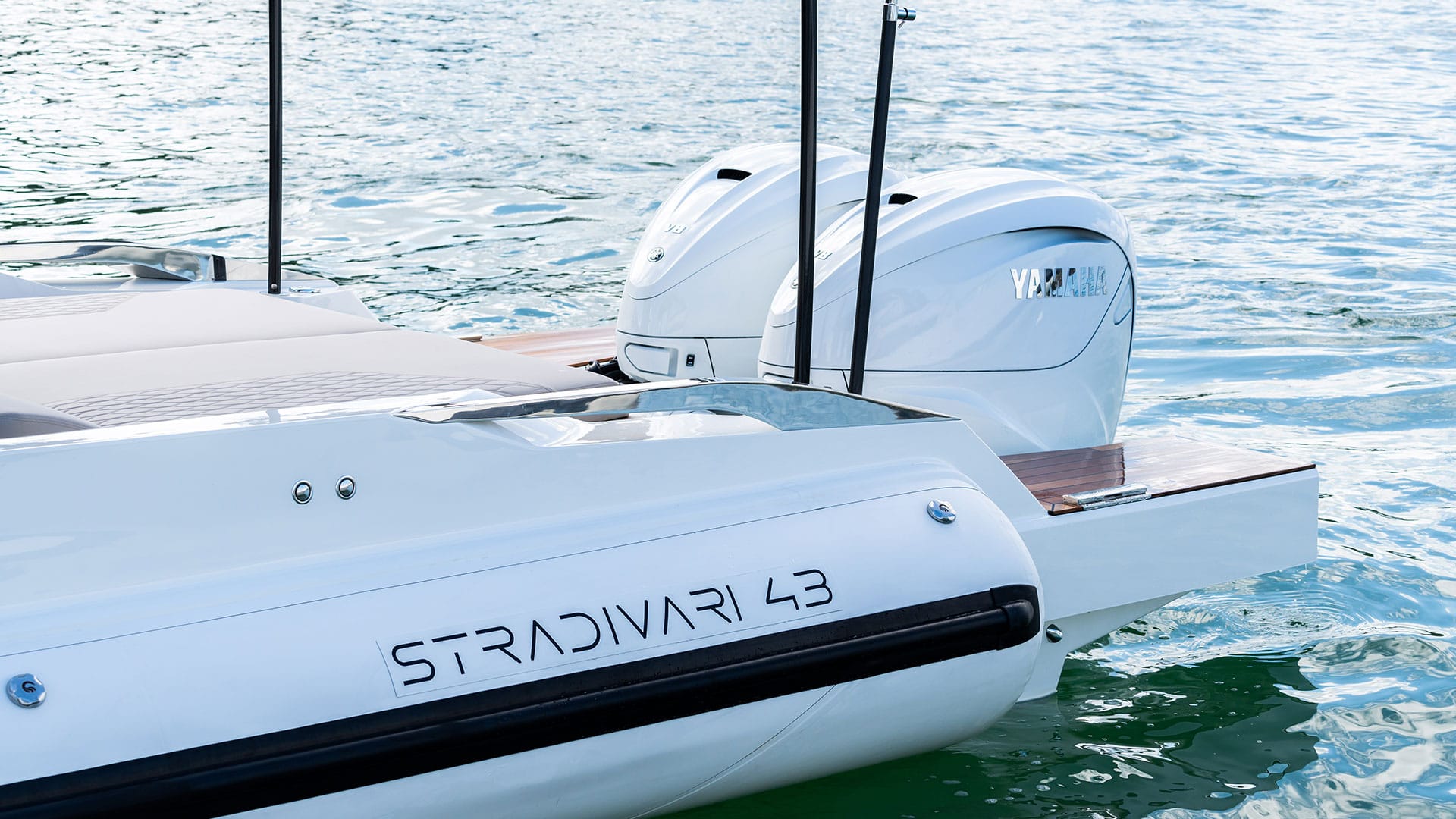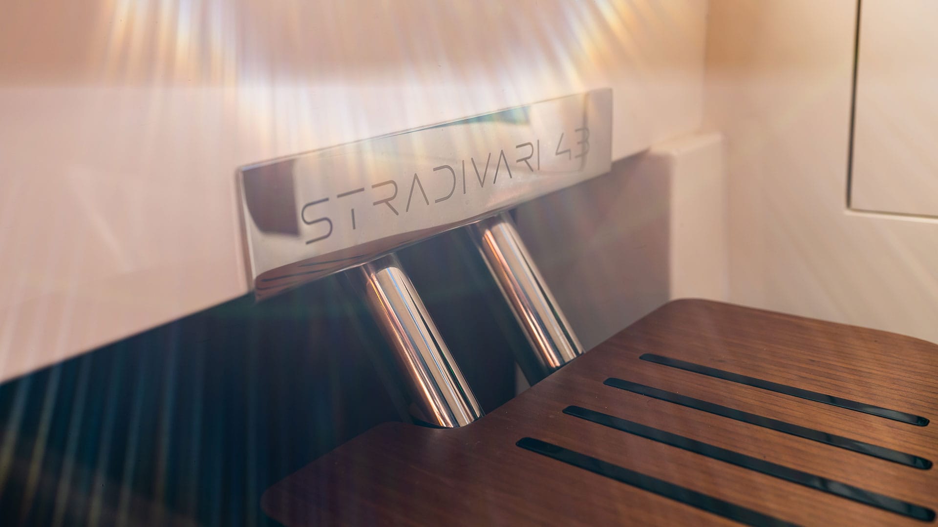 Stradivari 43 è il risultato di uno studio meticoloso delle forme sinuose e morbide del violino e di un lavoro di astrazione che ha permesso di arrivare ad un concept che potesse integrarsi con le esigenze tecniche del battello stesso. Artigianalità, innovazione stilistica, alto livello di progettazione e industrializzazione, meticolosa attenzione per i dettagli e le finiture, sono i punti cardine di questo prodotto.