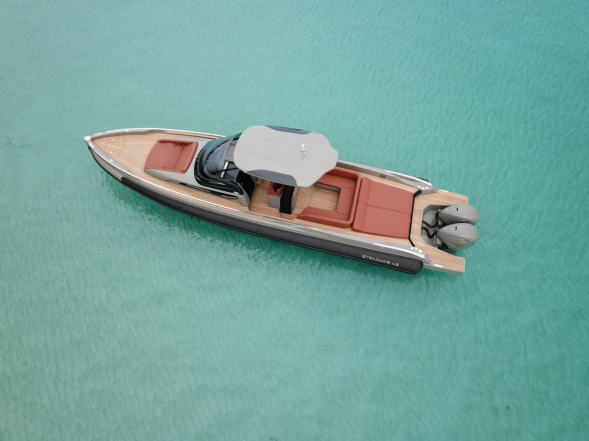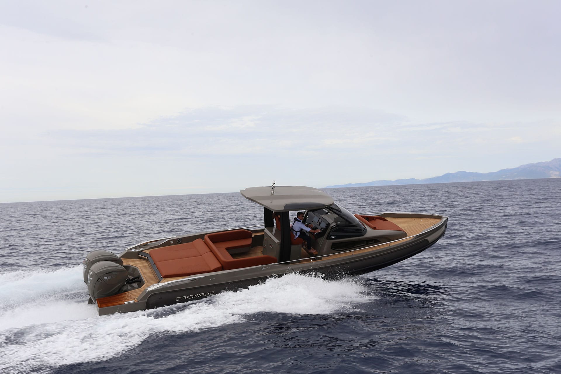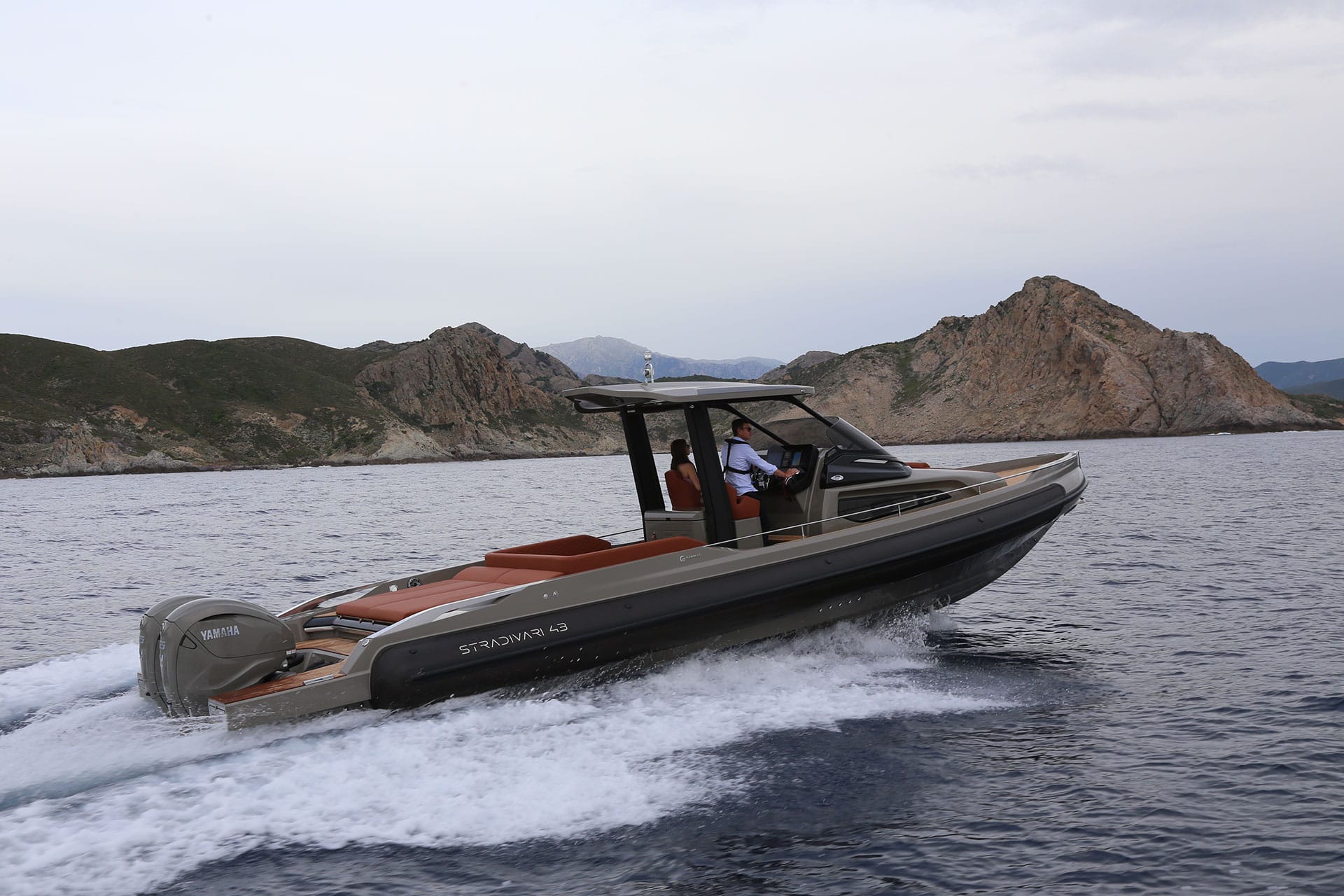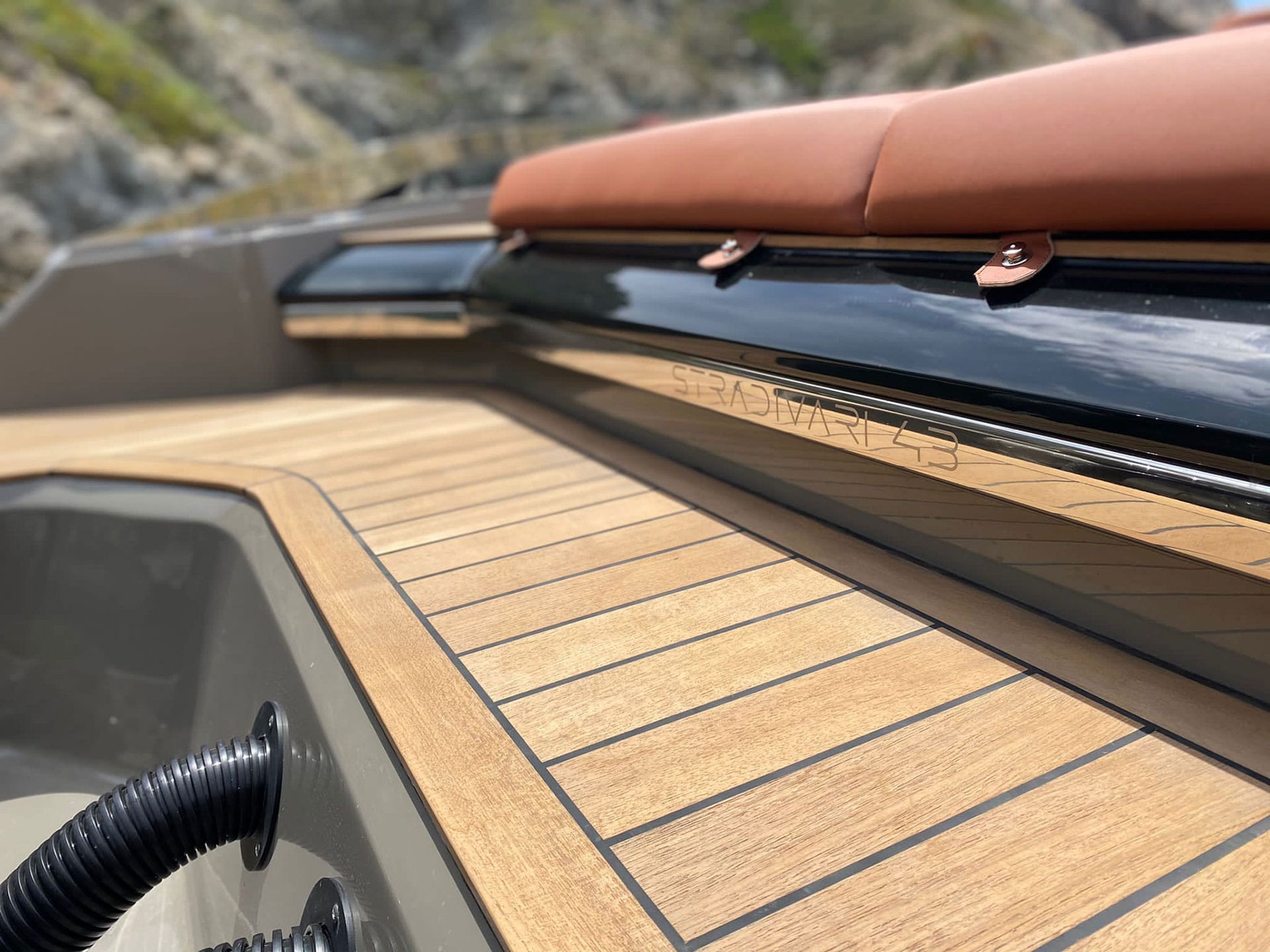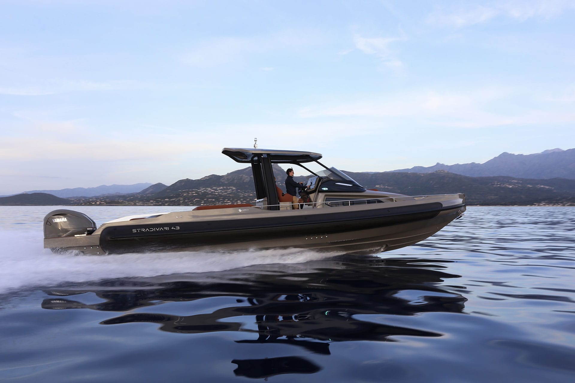 Stradivari 43 è il risultato di uno studio meticoloso delle forme sinuose e morbide del violino e di un lavoro di astrazione che ha permesso di arrivare ad un concept che potesse integrarsi con le esigenze tecniche del battello stesso. Artigianalità, innovazione stilistica, alto livello di progettazione e industrializzazione, meticolosa attenzione per i dettagli e le finiture, sono i punti cardine di questo prodotto.